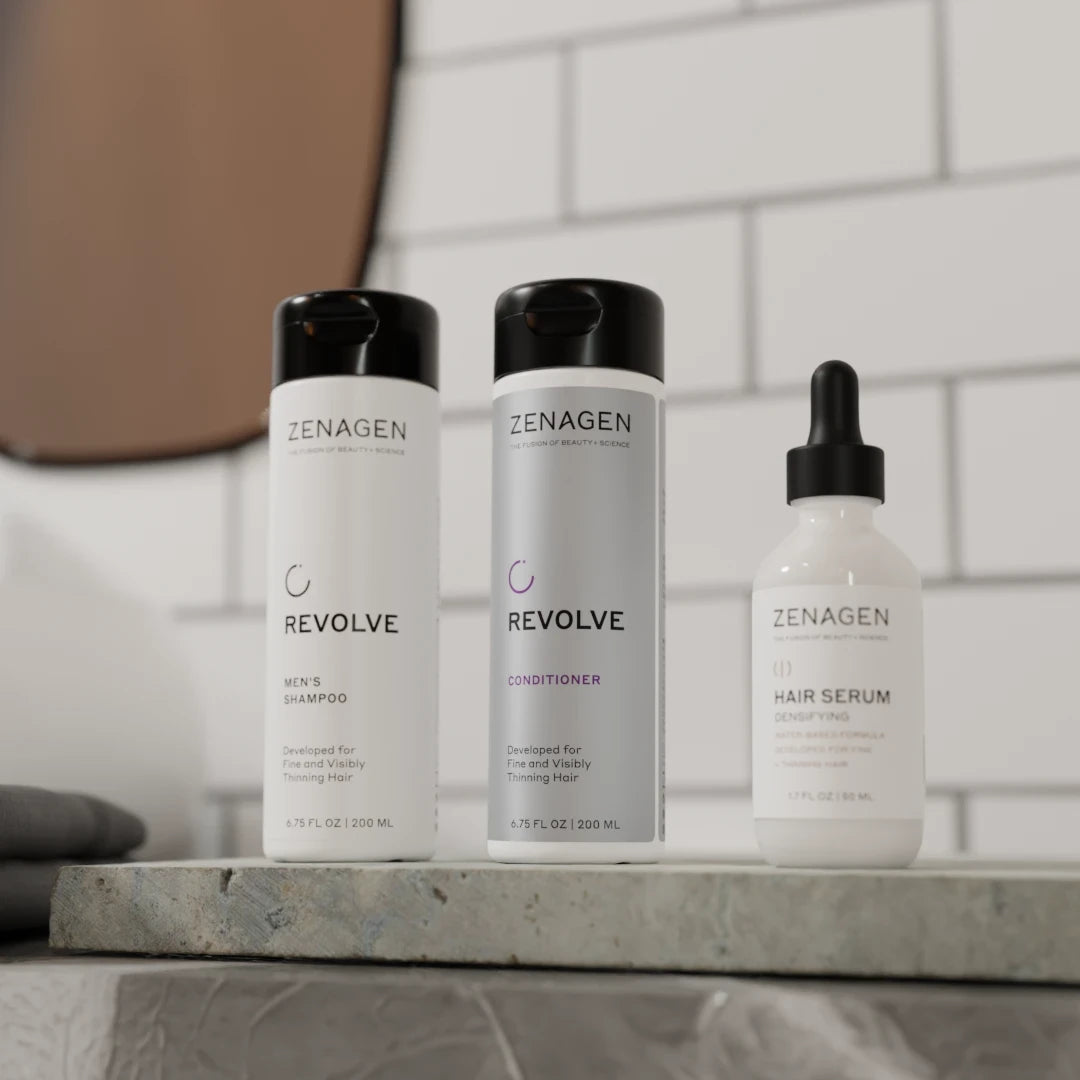 The Zenagen Revolve Men’s Densifying Kit is a 30-day kit that combines three powerfully simple steps to transform your daily routine: cleanse, condition, and densify. This plant-powered trio helps support a balanced scalp, visibly thicker hair, and lasting confidence — all in an effortless, salon-tested system designed specifically for men.
