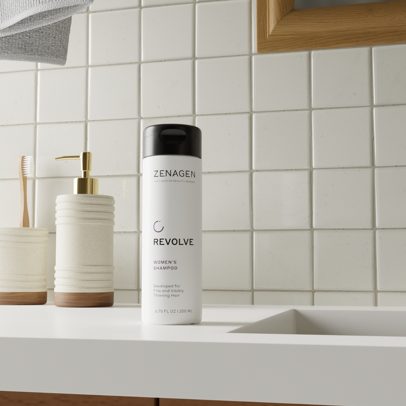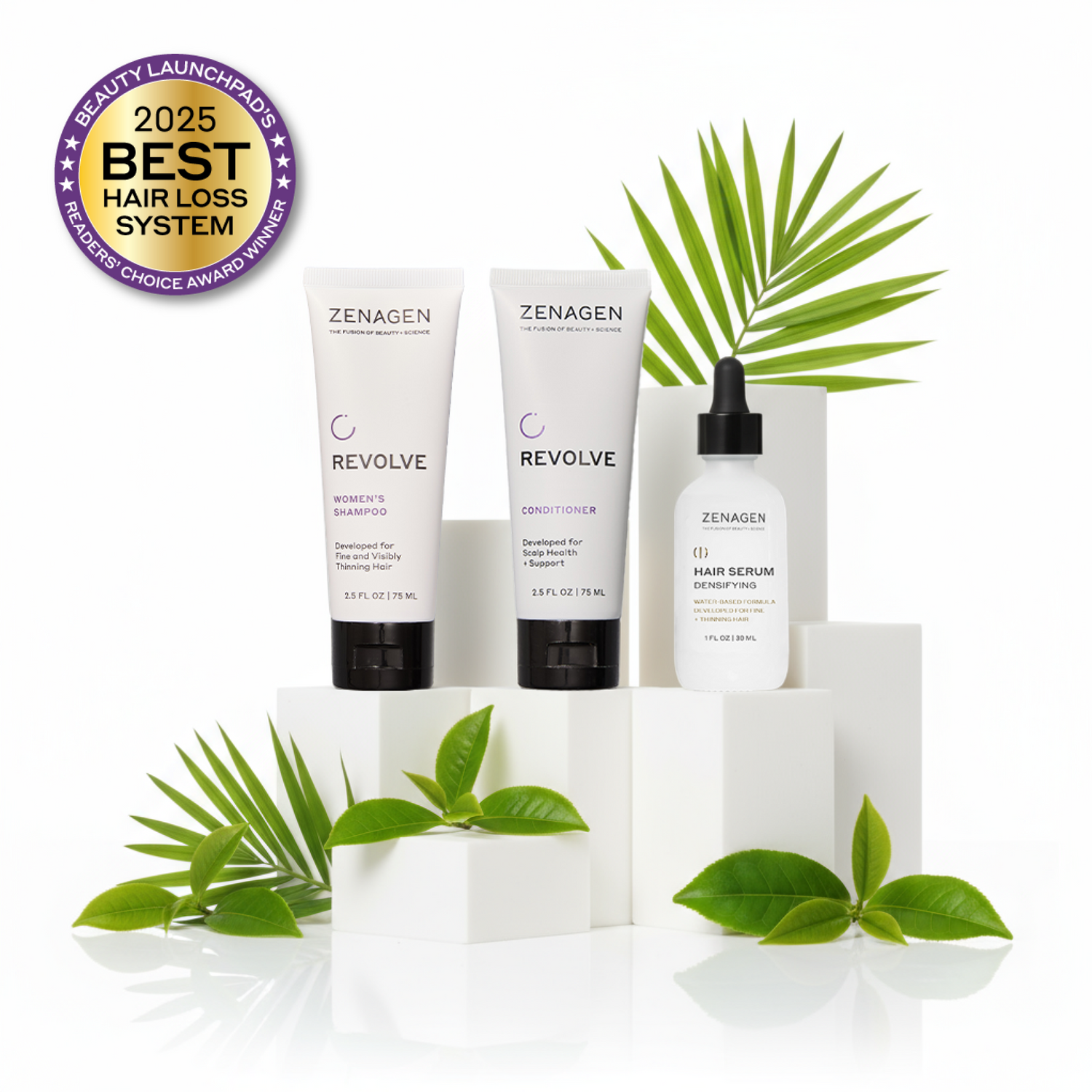The Zenagen Revolve Women’s Densifying Kit unites three professional-strength essentials that work in harmony to support scalp health and visibly denser, stronger-looking strands. This complete 30-day kit, 3-step system is designed for women experiencing hair thinning or shedding and seeking a clean, plant-powered solution that fits seamlessly into any routine.